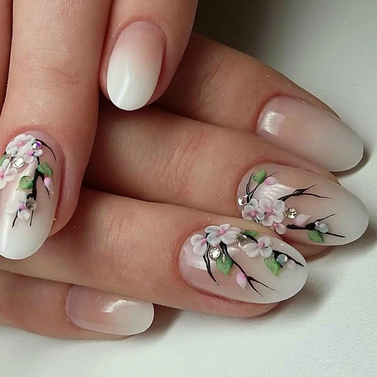 Незалежно від кольору основи манікюру її можна доповнити флористикою у всіх проявах. Вдало виглядатимуть гілочки та квіточки, а також об’ємні орнаменти.