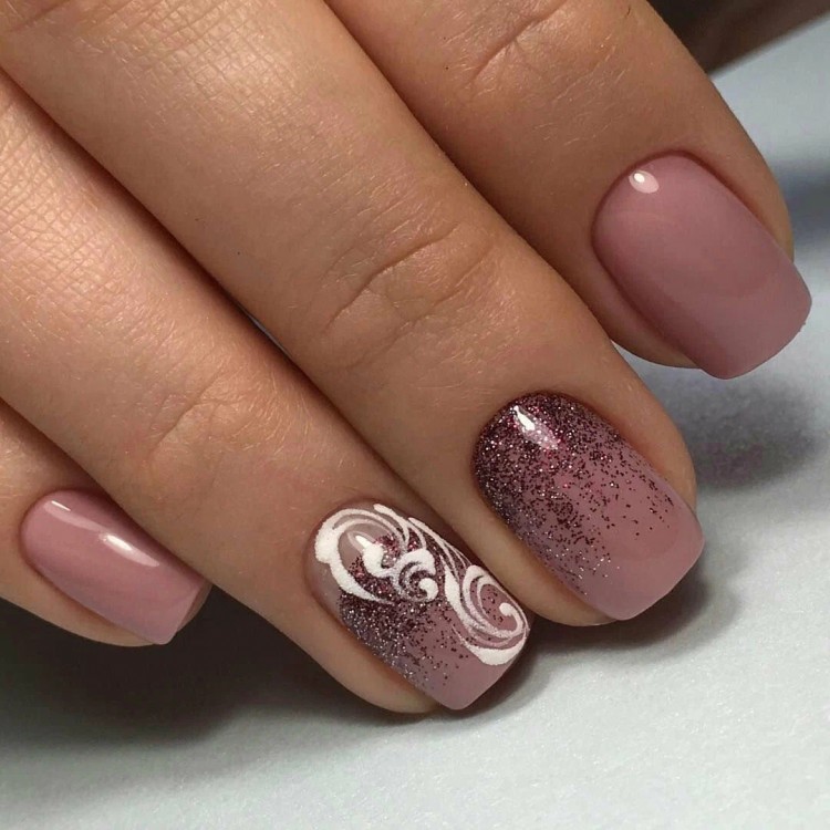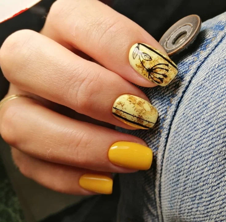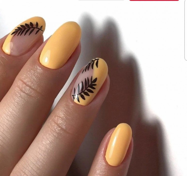 Манікюр можна доповнити тематичними малюнками у вигляді листочків та витончених гілочок, а також контрастних смужок та геометричних фігур.