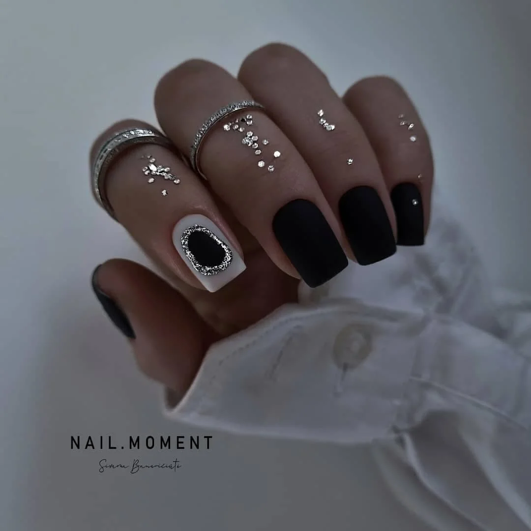 На коротких нігтях квадратної форми чудово виглядають прикраси у вигляді однотонних або різнокольорових паєток, страз і дорогоцінних каменів. Вони красиво переливаються на світлі. Їх можна додати абсолютно на будь-яку техніку нейл-арту. З їх допомогою можна зробити акцент на одному-двох пальцях руки або за бажанням прикрасити відразу всі нігті обох рук.