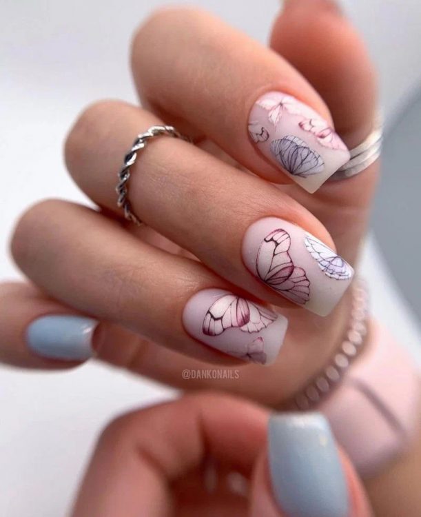 Цей варіант дизайну став одним із топових. Гарні та яскраві метелики ідеально підійдуть для літнього манікюру. Такий дизайн дуже милий, ніжний та романтичний, тому впишеться у будь-який літній образ.