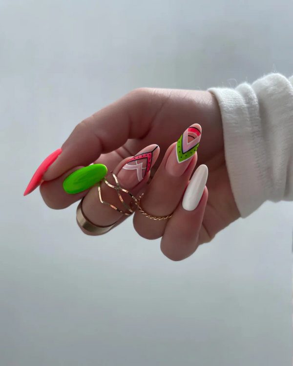 Ще один варіант дизайну, що не втрачає актуальності. Літо 2022 року не стало винятком, адже геометрія – це не тільки строгість і стиль, а й унікальна можливість втілити в життя яскравий дизайн, що ідеально підходить для літнього манікюру.
