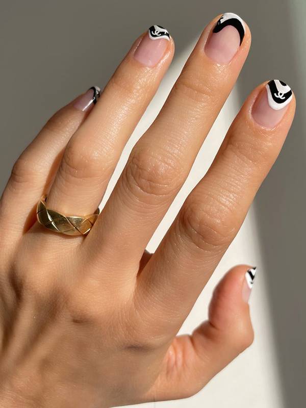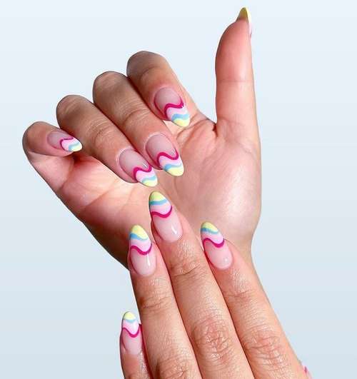 Порада для тих, хто хоче проявити свою фантазію – спробуйте використати у дизайні хвилясті лінії. Варіантів багато, а із поєднань відтінків найкраще виглядатимуть білий, бірюзовий, блакитний, з елементами у вигляді срібної чи золотої фольги. Цікавим та привабливим буде дизайн, коли весь ніготь пофарбований нюдовим відтінком, а хвилі намальовані білим лаком. Також добре виглядають варіанти з м’ятним та лимонним відтінками. Головне, щоби хвиля добре читалася на нігтях, а її межі були максимально чіткими.