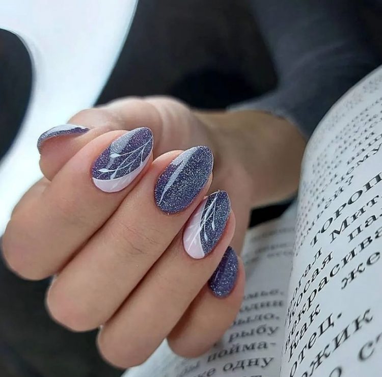 Якщо вам хочеться внести трохи свята у своє життя, то радимо спробувати використати блискітки як елементи дизайну у синьому манікюрі. До речі, особливо гармонійно виглядають срібні блискітки разом із насичено темним відтінком синього лаку.
