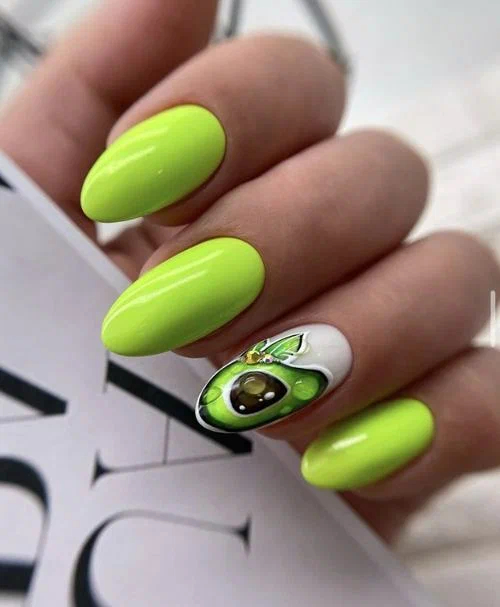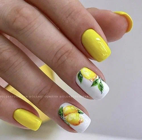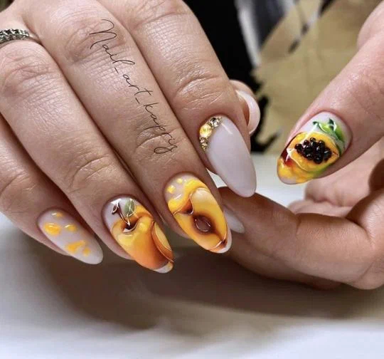 Четверте місце у нашому літньому nail-параді цього року знову займає всіма улюблений дизайн з різними малюнками: фруктів та ягід, квітів та метеликів, моря та пальм, та інших різних малюнків у літній тематиці.