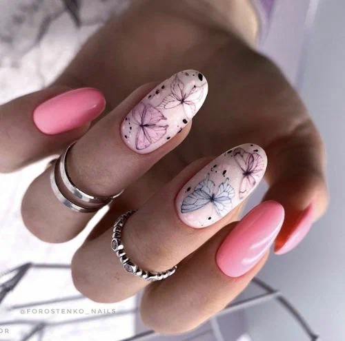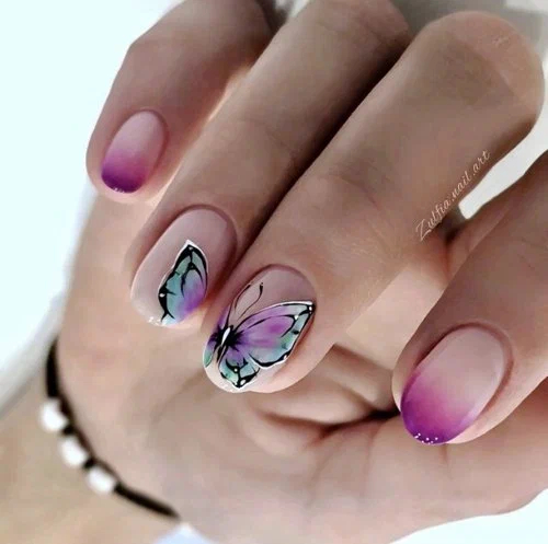 Цього сезону, знову дуже модним є дизайн з малюнками метеликів. Вони символізують літо та легкість. Дуже красиво і яскраво виглядають малюнки метеликів у поєднанні з жовтою, рожевою та блакитною основою. Якщо ж їх нанести на основу прозорого, нюдового або молочного кольору, то таке поєднання буде виглядати дуже ніжно і витончено.