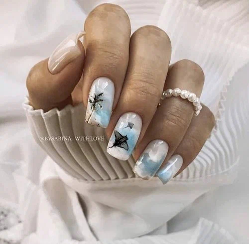 Четвертий по-популярності дизайн з малюнками – це варіанти у морській відпускній тематиці. Яке ж літо – без відпочинку на морі. Море, пальми, морські жителі, тропічні квіти і рослини, і все що з цим пов’язано, хочуть бачити у себе на нігтях красуні, вирушаючи в довгоочікувану подорож. Подивіться лише, які красиві та незвичайні малюнки роблять талановиті nail-майстри цього літнього сезону.