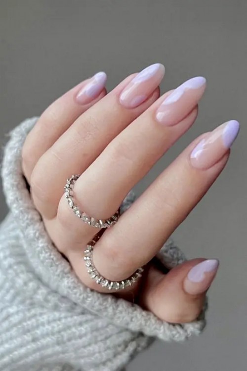 Ніжний фіолетовий манікюр на гострих нігтях