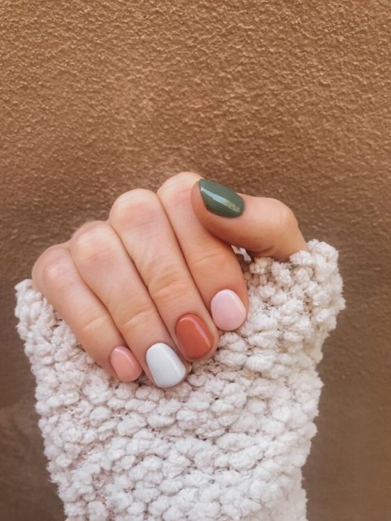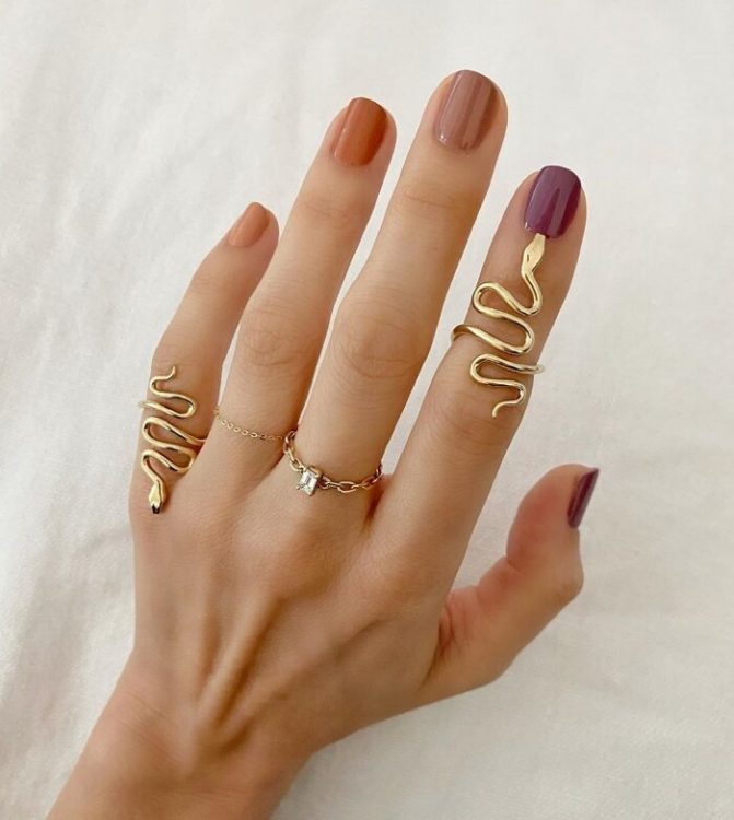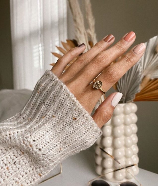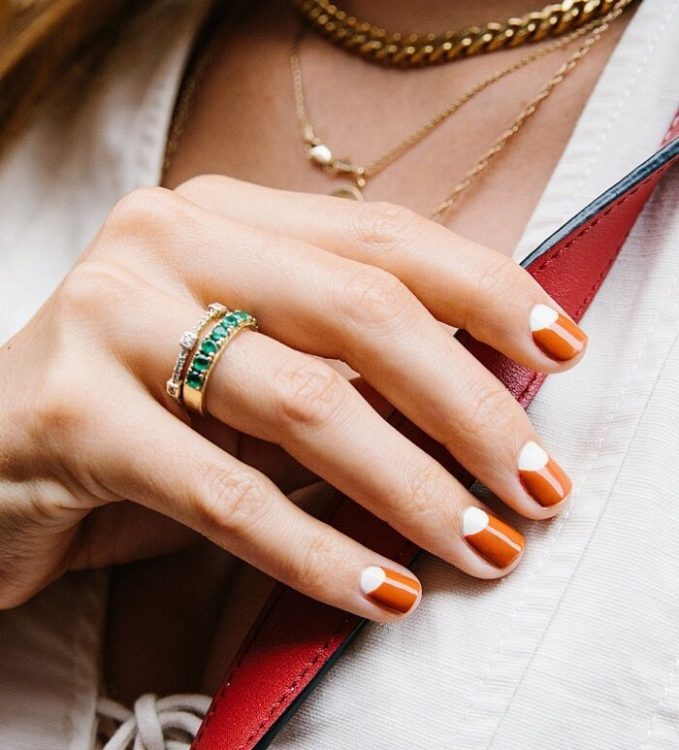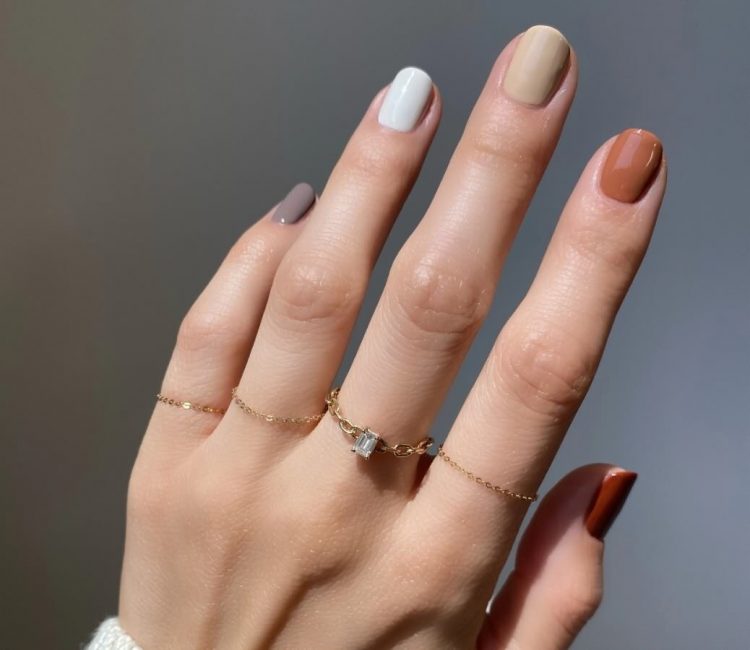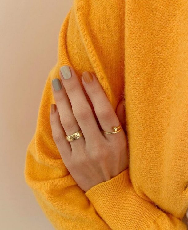 У числі популярних трендів у манікюрі — сolor-blocking, тому цього сезону вам знадобиться вміння комбінувати різні відтінки та текстури, наприклад, гарбузові, бежеві тони та золотий шиммер.