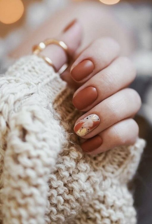 Ви можете обрати малюнок на нігтях у вигляді кленового листя, гарбуза або, навіть, дерев, які асоціюються з поточним сезоном. Акценти у вигляді намальованого листя, квітів або чогось ще, що спаде на думку, стануть саме тією шикарною деталлю, яка виділить манікюр серед інших. Як варіант – просто прикрасьте нігті лаком насиченого відтінку і додайте трохи шиммеру для контрасту.