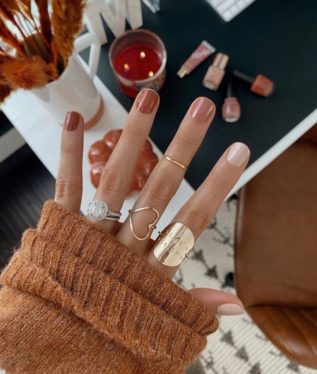 Це втілення осінньої стриманості, скромності та згасання природи. Осінь асоціюється із затишком, домашнім теплом, пирогами та гарячим чаєм, тому теплі тони будуть актуальними. Цієї осені вони в тренді, але спробуйте комбінувати їх з блискітками або ніжними відтінками.
