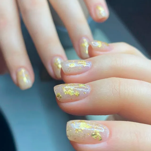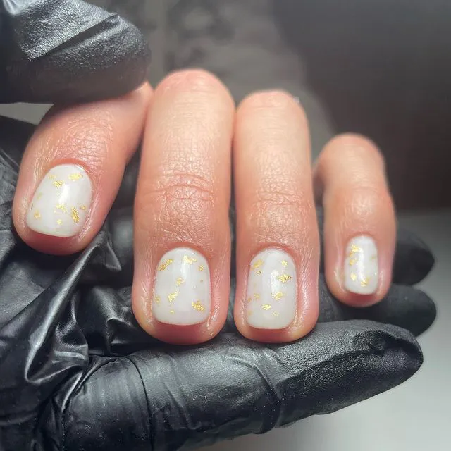Молочний манікюр із золотою фольгою на коротких нігтях