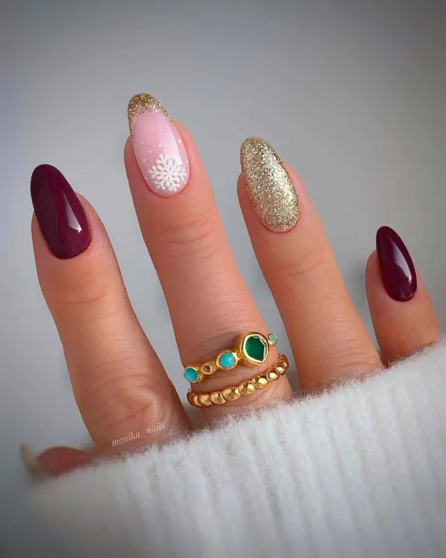 Новорічний бордовий манікюр із золотими блискітками та сніжинкою