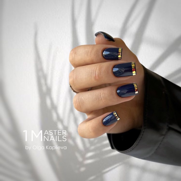 Оксамитове покриття нігтиків ідеально поєднується із золотим декором. Осінні золотисті мотиви створюються на пластинах фольгою золотого кольору, глітером, золотистими стразами. Причому такий дизайн чудово виглядає як на довгих, так і на коротких нігтях.
