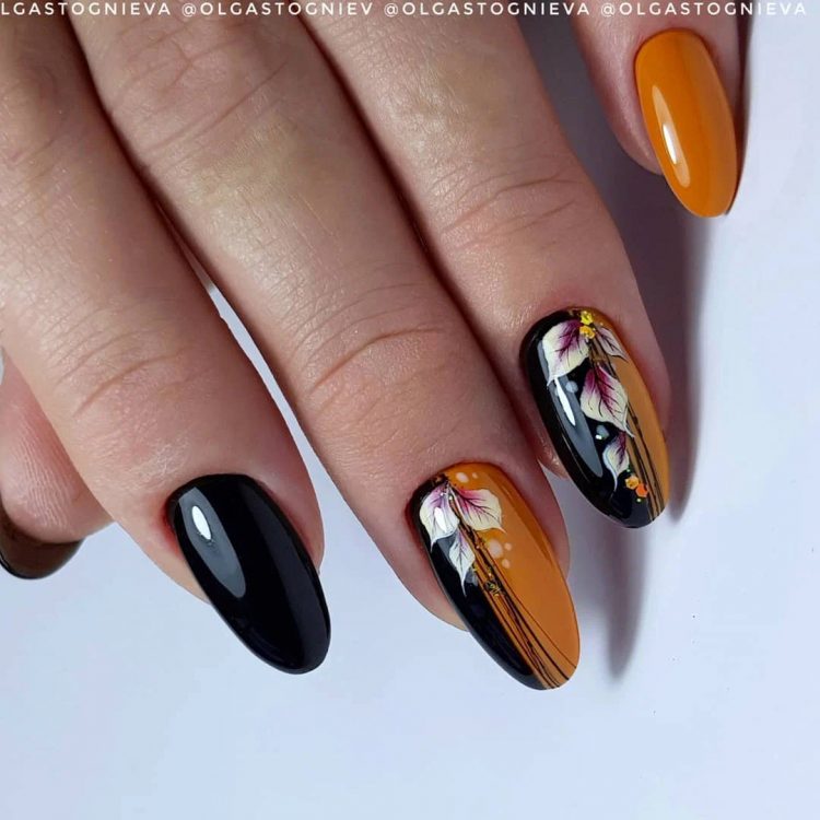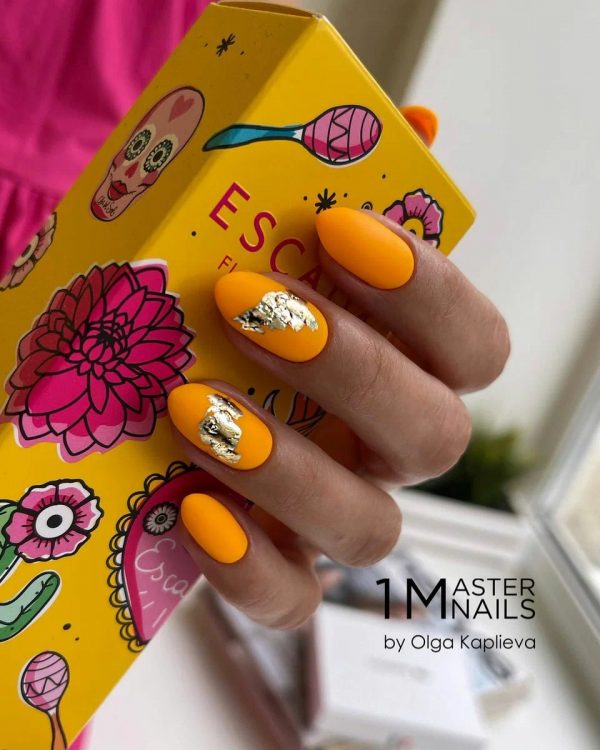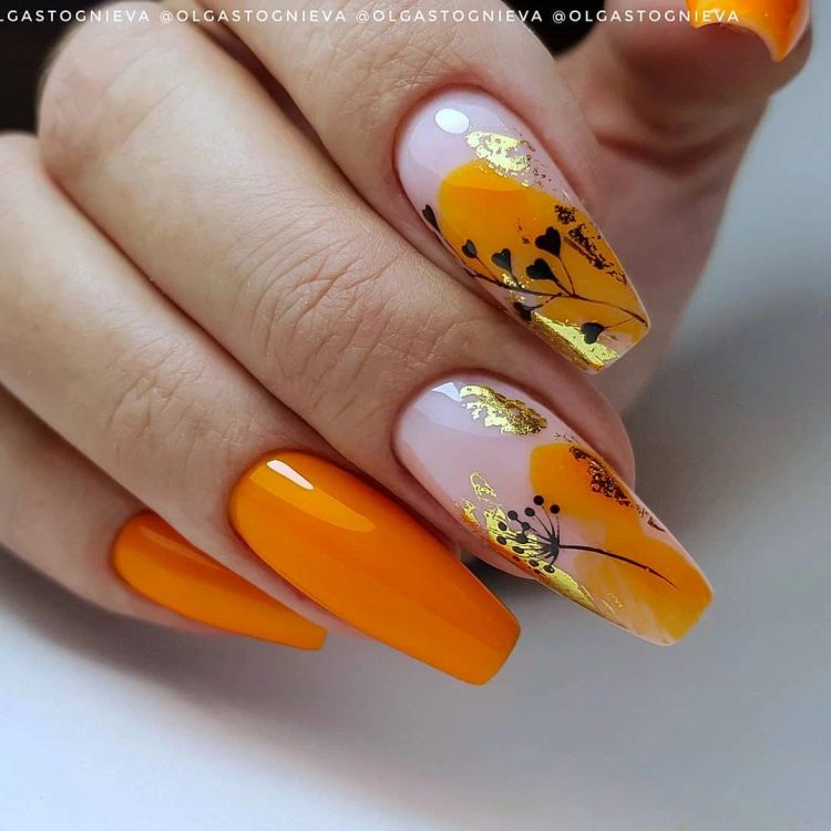 Помаранчеві, червоні та жовті відтінки восени виходять на перше місце. Цього сезону варто спробувати цікаве поєднання помаранчевого разом із золотим. Дорогоцінна деталь чудово передається за допомогою фольги або глітеру.