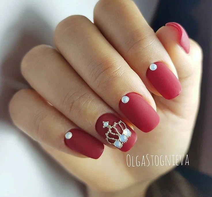 Червоний манікюр – це найкрасивіший дизайн на осінь, але його можна зробити ще більш привабливим та соковитим. Для цього жінкам рекомендують покрити нігті матовим топом і доповнити манікюр блискучими стразами.