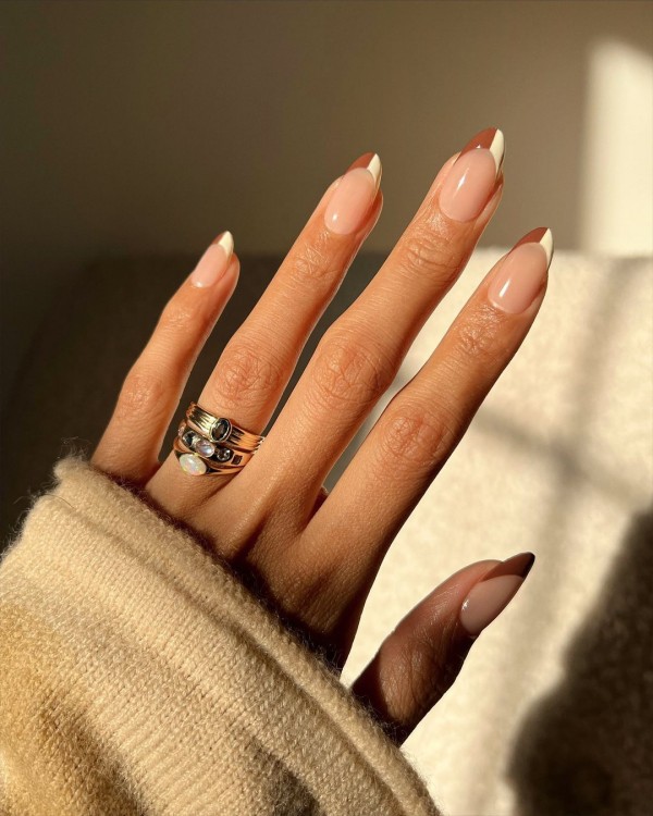 Ще одна ідея – графічний френч: попросіть майстра намалювати на вільному краї дві чіткі смуги коричневого і білого кольорів, вони чудово поєднуються один з одним.