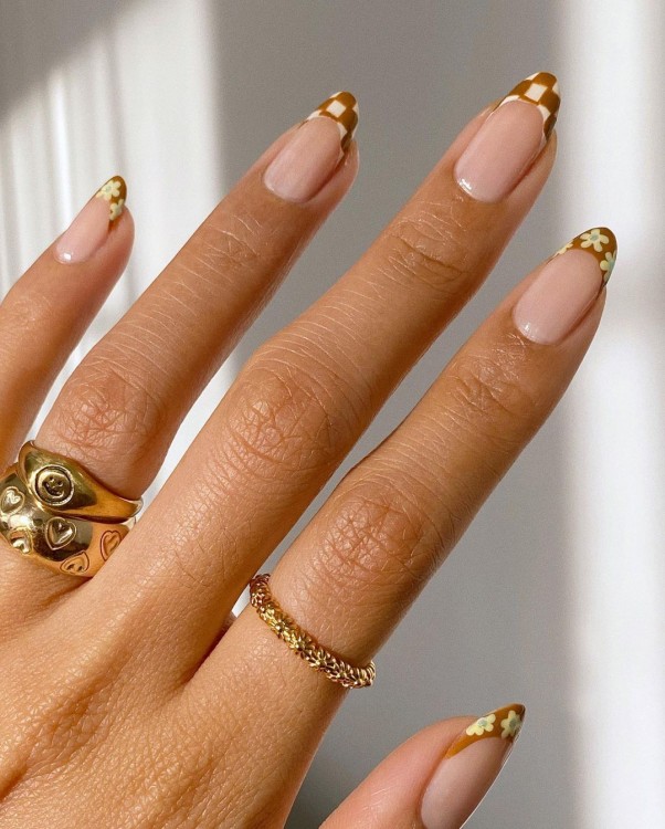 Трохи наївний дизайн з ромашками, що став популярним цього літа, можна виконати і в коричневих відтінках, поєднуючи темний і світлий лаки. Попросіть майстра зробити дизайн, що нагадує знак інь-ян, тільки замість цяток потрібно намалювати квіти.