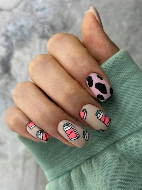 Мило і кумедно – так можна назвати нейл-арт, у якому є плями корови та пакетик із молоком. Мабуть, такий дизайн воліють робити тільки найсміливіші модниці.