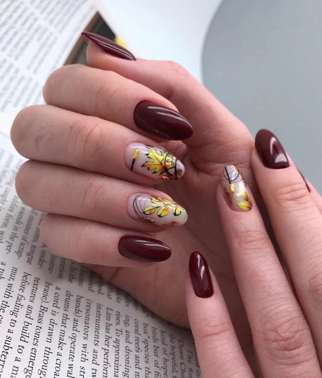 Чудовим варіантом буде манікюр з відтінками бордового кольору, в якому можуть бути осінні малюнки у вигляді красивого листя.