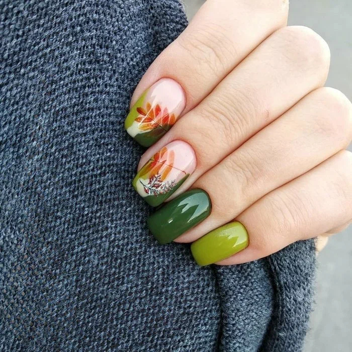 Флористичні мотиви в осінній сезон набувають іншого оформлення, тому що нейл-майстри зазвичай роблять їх менш яскравими, надаючи листочкам та квіточкам осіннього звучання.