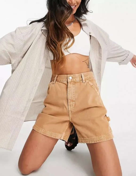 Джинсові шорти – основа літнього гардеробу. Наш вибір – модель з високою посадкою і широкими штанинами нейтрального бежевого кольору.