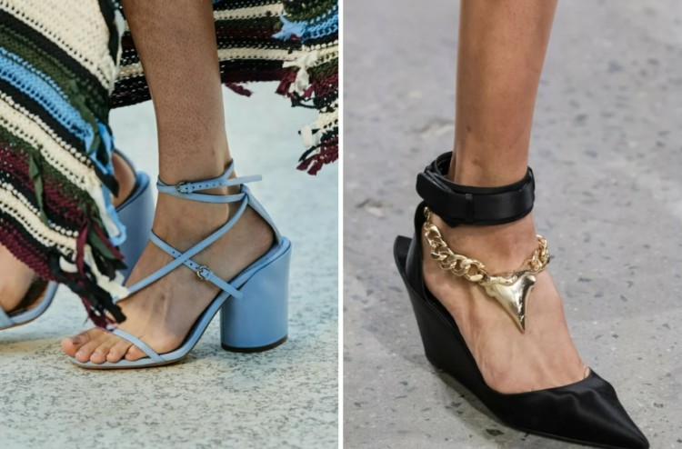 Тренд на ланцюги торкнувся всього, і аксесуарів, і сумок, і взуття. Туфлі, Мюлі, босоніжки з ланцюгами гарячий тренд 2020. Це можуть бути товсті ланцюги або тонкі ланцюжки. Якщо у вас широка стопа і масивна нога, кращим вибором буде великий ланцюг. На тонких ніжках найкраще виглядають акуратні, хоча можна пограти з контрастом.