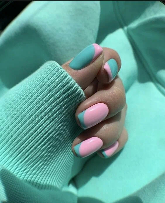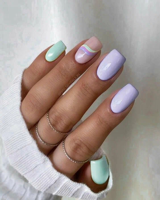 Ніжний синій, пастельно-жовтий або пудрово-рожевий виглядає чудово, особливо якщо поєднувати всі ці кольори разом. Наприклад, у вигляді шахівниці або якщо одна половинка нігтьової пластини буде одного кольору, а інша частина – іншого кольору.