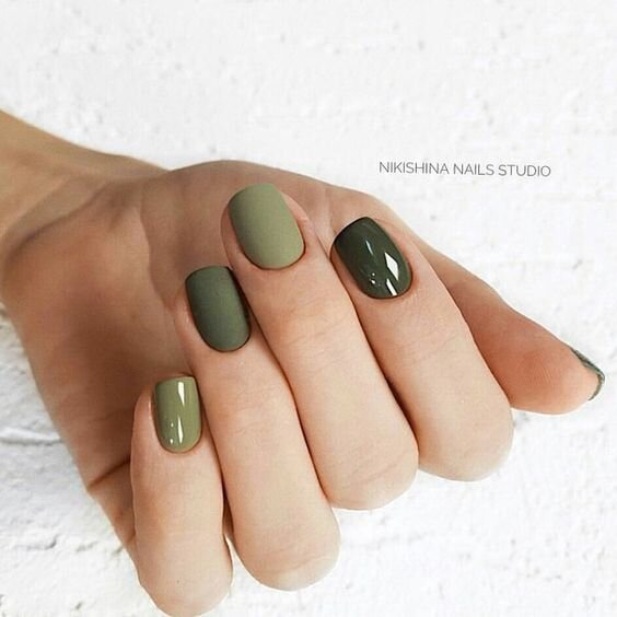 Наступний тренд у нейл індустрії, який підкорить серця багатьох сучасних красунь – це манікюр в благородному кольорі хакі. Причому в одному манікюрі може бути використаний як один відтінок, так і відразу кілька. Комбінуйте матовий лак з глянцевим – це зробить зовні ваш манікюр більш привабливим, сучасним та багатогранним.