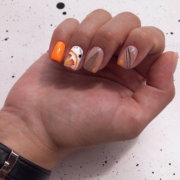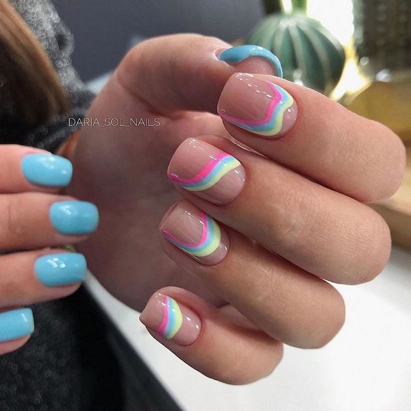 - тематичний дизайн нігтів на кожен день з актуальними тематичними малюнками, що привабливо виглядають у рожевому, помаранчевому, блакитному, синьому, зеленому, жовтому кольорі;