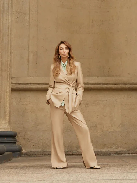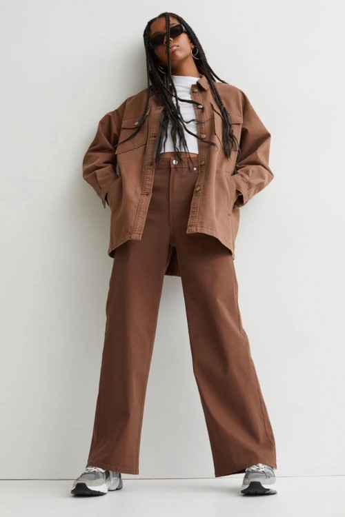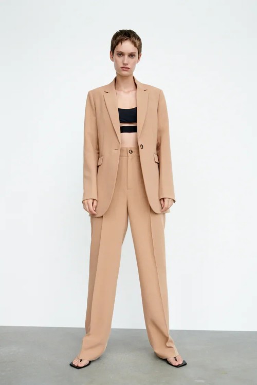 Базовий варіант – штани з високою посадкою в нейтральному кольорі. Вони чудово поєднується практично з усім взуттям. Крім цього, можна прикупити блейзер і носити як костюм або зупинитися виключно на одних штанах. Така модель – це чудова альтернатива нудним чорних штанам.