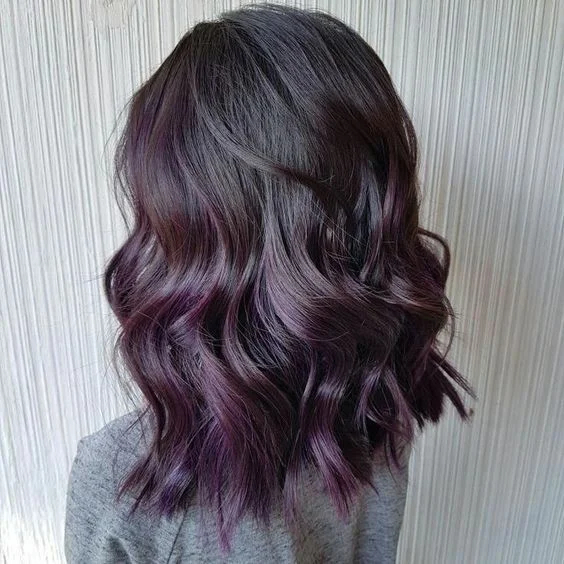 Тонкі темно-пурпурові пасма в чорному волоссі виглядають елегантно. Такий вид фарбування підійде тим, хто хоче злегка пожвавити зачіску і надати їй більш глибокого відтінку.