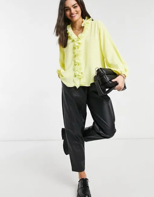 Романтична жовта блуза з рюшами доповнить чорні шкіряні штани або лаковану міні-спідницю. У такому вбранні можна піти на вечірку, якщо додати пару акцентних прикрас, або на неформальну зустріч.