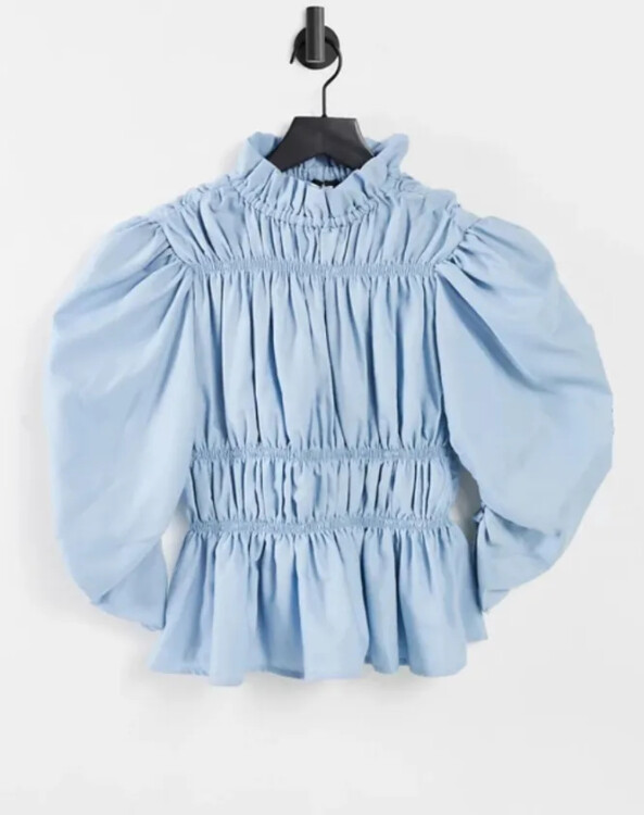 Структурована блуза з попліну в трендовому блакитному кольорі гармонійно виглядає з білими джинсами, зухвалими шкіряними штанами і спідницями по фігурі.