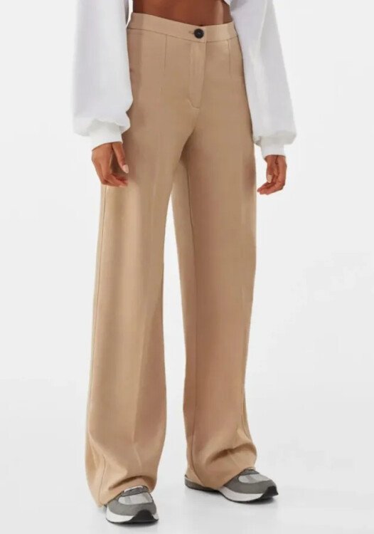 Широкі штани з високою посадкою вже носять модниці по всьому світу. якщо не хочете відставати, зверніть увагу на модель прямого крою зі стрілками в універсальному бежевому кольорі.