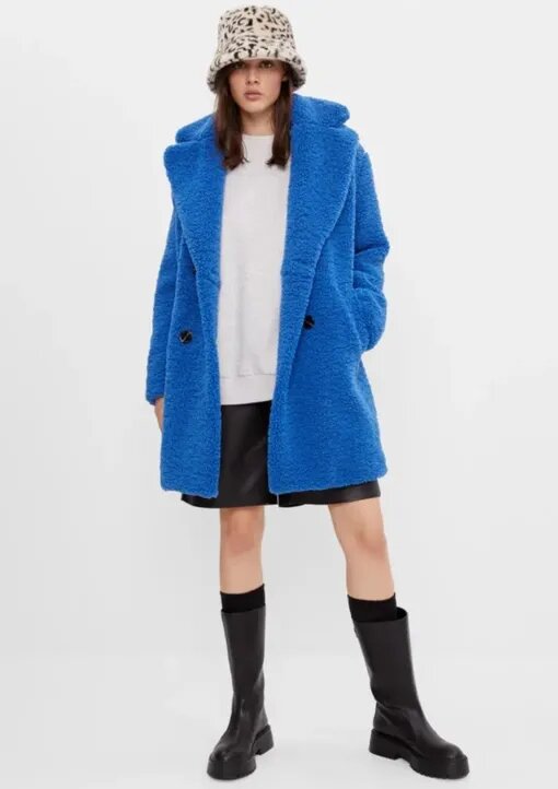 Зимовим образам часто не вистачає фарб. У цьому сенсі урізноманітнити гардероб допоможе пальто з яскравого штучного хутра. Наш вибір – модель насиченого, глибокого синього відтінку. Воно гармонійно впишеться в монохромний образ, а також вдало доповнить базовий ансамбль з джинсами і светром. Якщо ви не боїтеся модних експериментів, спробуйте зібрати аутфіт в стилі колор-блок: одягніть під пальто светр гірчичного кольору, світлі брюки і додатковий комплект акцентної чорної сумки і взуття.