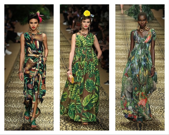 У новому сезоні Dolce & Gabbana пропонує варіацію на тему яскравого квіткового принта – джунглів. На сукнях, боді і спідницях розпускаються не золоті троянди, як раніше, а переплітаються в химерний малюнок ліани і папороті. (Авторське прочитання італійцями екоруху, який набирає обертів в fashion-індустрії?)