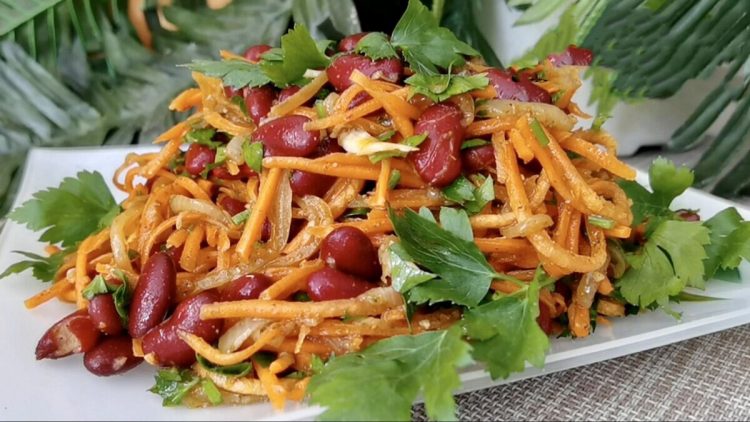 Такий салат із моркви та квасолі часто роблять навіть на святковий стіл. Він виходить дуже смачний, ситний, сповнений ароматом спецій. І готувати його теж швидко.