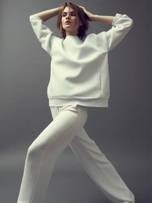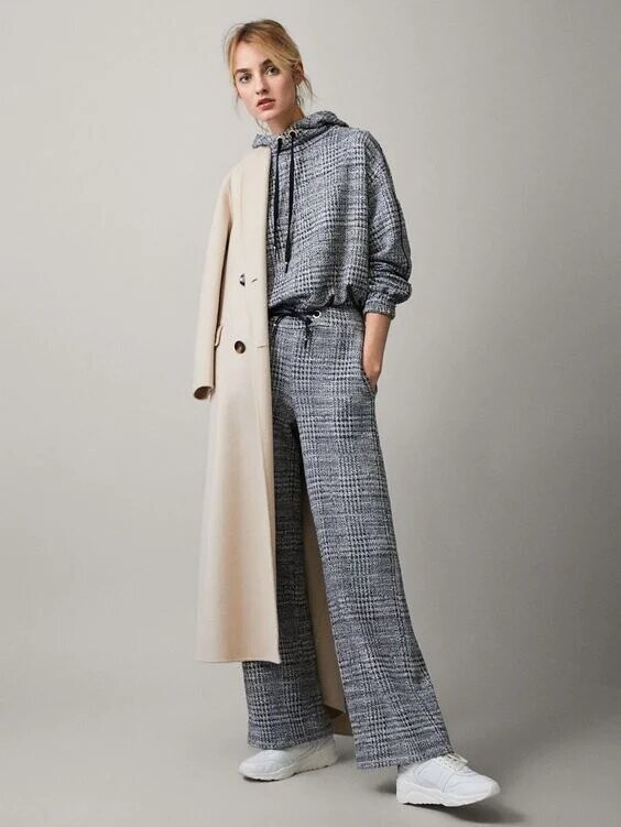 У такому костюмі можна піти на роботу або на прогулянку з дитиною. Для того, щоб створити максимально комфортний образ доповнюємо його водолазкою в тон і кросівками.