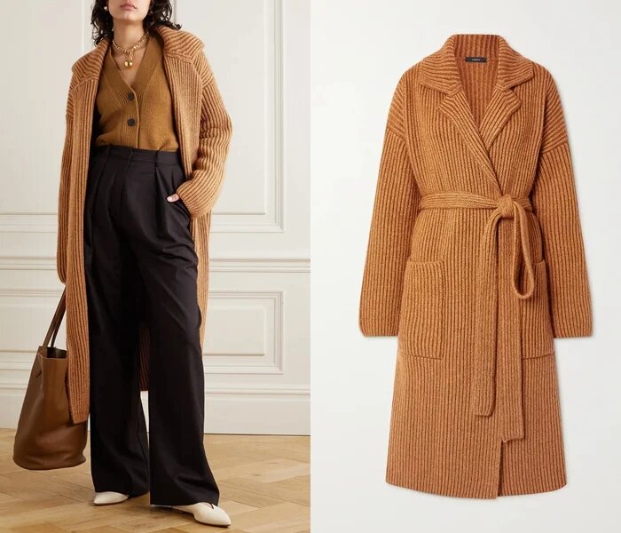 Це кашемірове пальто в’язки «гумка» з відкладним комірцем, поясом і накладними кишенями дуже схоже на затишний домашній халат. Але якщо одягнути його, наприклад, з брюками, воно ідеально вписується в повсякденний осінній гардероб – точно як класичне кашемірове пальто на запах з колекції Max Mara.