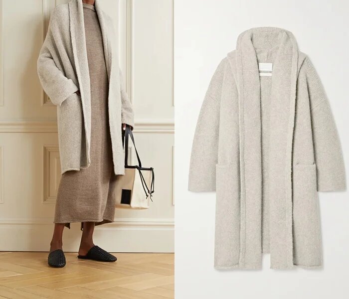 Lauren Manoogian пропонує мінімалістичний сіро-бежевий кардиган з лацканами і кишенями, з вовни альпаки. Його можна носити з гладкою трикотажною максі сукнею, вписуючи в лаконічний наряд з чистими лініями в нейтральних базових відтінках.
