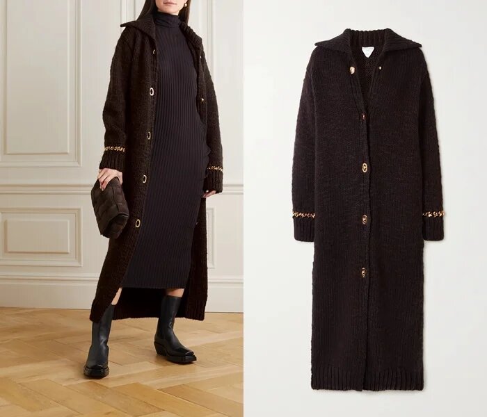 Ще одна тепла модель трикотажного пальто, в якому відчуваються ретро-мотиви. Коричневе пальто Bottega Veneta оброблене золотими гудзиками і золотою прострочкою рукавів, які служать ненав’язливою «родзинкою» образу. Ця річ буде чудово поєднуватися з сумкою або взуттям із золотистою фурнітурою.