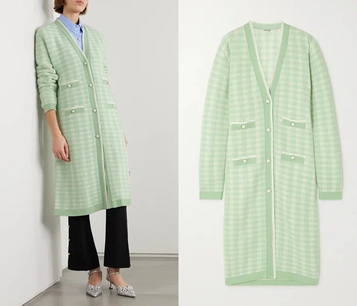 У цьому ніжному м’ятному кардигані від Miu Miu проглядаються риси класичного жакету Chanel – і в клітинці, і в невидимих декоративних кишенях. Подібний дизайн робить його унікальним предметом гардеробу, що поєднує образ пальто, кардигану та жакету.