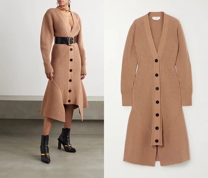 Колекції Alexander McQueen не обходяться без родзинки, і це в’язане пальто не виняток. Модель бежевого кольору з контрастними чорними гудзиками має виділену лінію талії і зону спідниці, тому підійде жінкам, які хочуть підкреслити свою фігуру. Пальто створене з суміші вовни і кашеміру.