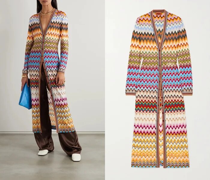 Missoni був і залишається брендом, який асоціюється з трикотажем, вузьким кроше і яскравими контрастними смужками, в даному випадку – хвилеподібно-звивистими. Це пальто-кардиган тонке, воно відрізняється етнічним модним звучанням, яке можна зробити ще більш вираженим за допомогою автентичних аксесуарів.