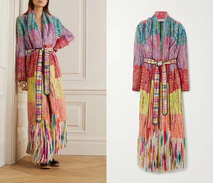 Дизайнерський будинок Gabriela Hearst не випускає тривіальний одяг або аксесуари, що в черговий раз добре помітно в цьому незвичайному трикотажному пальто з етнічними мотивами. Багатобарвність, недбалість дизайну, довга бахрома і пояс – це одяг не для боязких модниць.