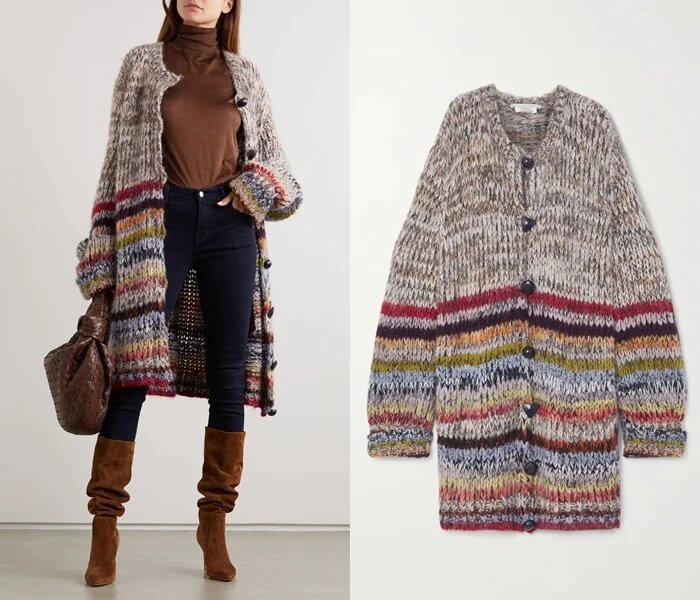 Кардиган з вовни альпаки, який увійшов в колекцію осінь / зима Stella McCartney – це справжня ода «бабусиному гардеробу». Він виглядає нарочито недбалим і витягнутим, але так і задумано! Якщо ви не боїтеся ефекту поношеного розтягнутого трикотажу, зверніть увагу на таку модель, яка внесе ноту потертої чарівності в невигадливий комплект, наприклад, з водолазки і джинсів.