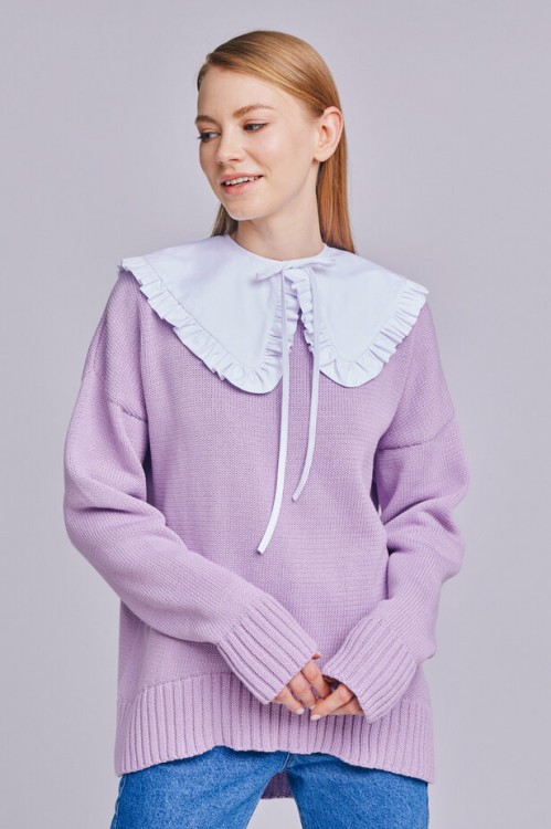 Однотонні вовняні светри з акцентним білим коміром – ідеальна база для зимового сезону. У такій речі ви точно не замерзнете, і завжди почуватиметеся максимально жіночно та елегантно. На наступному прикладі можна переконатися, що жіночні светри з акцентними ажурними комірами ідеально компонуються зі шкіряними штанами та спідницями.