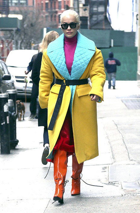Ріта Ора любить одягатися яскраво. Але в цьому випадку вийшло, що гра відтінків в її вбранні, як об скелю, розбивається об чорний пояс, перетягуючи фігуру і розрізає її навпіл. Пояс, що повторює один з уже використаних в образі кольорів, був би тут більш доречний.