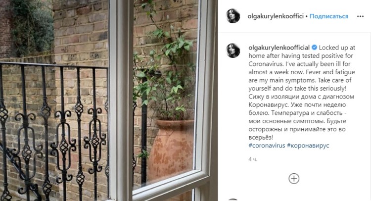“Сиджу в ізоляції в будинку з діагнозом коронавірус. Вже майже тиждень хворію. Температура і слабкість – мої основні симптоми. Будьте обережні і приймайте це всерйоз!”, – написала Ольга.
