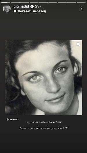 Свій біль від втрати близької людини висловила в інстаграмі Джіджі Хадід. Вона опублікувала архівні фото Гади, написавши: «Нехай наша тітка Гада спочиває з миром. Я ніколи не забуду її сяючі очі та посмішку».